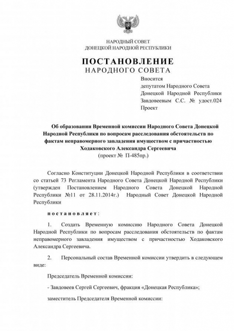 «На пленарном заседании Народного Совета, состоявшемся 27 февраля 2016 года, было принято постановление «Об образовании Временной комиссии Народного Совета Донецкой Народной Республики по вопросам расследования обстоятельств по фактам неправомерного завладения имуществом с причастностью Ходаковского Александра Сергеевича», — говорится в тексте сообщения.