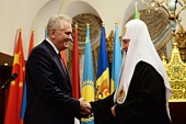 Святейший Патриарх Кирилл приветствовал высокого гостя, прибывшего в Москву для участия в церемонии вручения премии Международного общественного фонда единства православных народов. «Эту премию создали энтузиасты еще во времена Святейшего Патриарха Алексия II с тем, чтобы отметить заслуги людей, которые содействуют сохранению братских взаимосвязей между православными народами, сохранению веры православной, а также отмечены другими достижениями в области политики, международных отношений, искусства и науки», — подчеркнул Предстоятель Русской Православной Церкви.