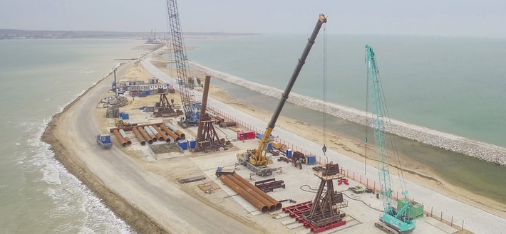 Началось возведение свайных фундаментов моста через Керченский пролив (15.03.2016)
