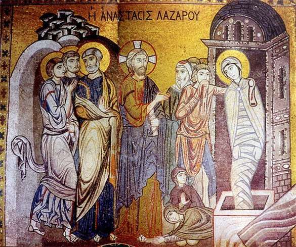 В «Лазареву субботу» православная Церковь вспоминает, как Иисус Христос воскресил из мертвых своего друга Лазаря, скончавшегося за четыре дня до этого события. В этот день в храмах совершается особая торжественная служба, предваряющая собой наступающий праздник Входа Господня в Иерусалим, получившего в России название Вербного воскресенья. Гимны Лазаревой субботы содержат в себе надежду на будущее всеобщее воскресение мертвых в конце земной истории.