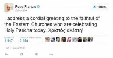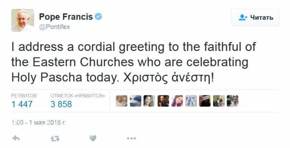 Свои поздравления православным христианам папа римский направил и через социальную сеть Twitter. Свое сообщение Франциск завершил фразой на греческом языке «Христос воскресе!»