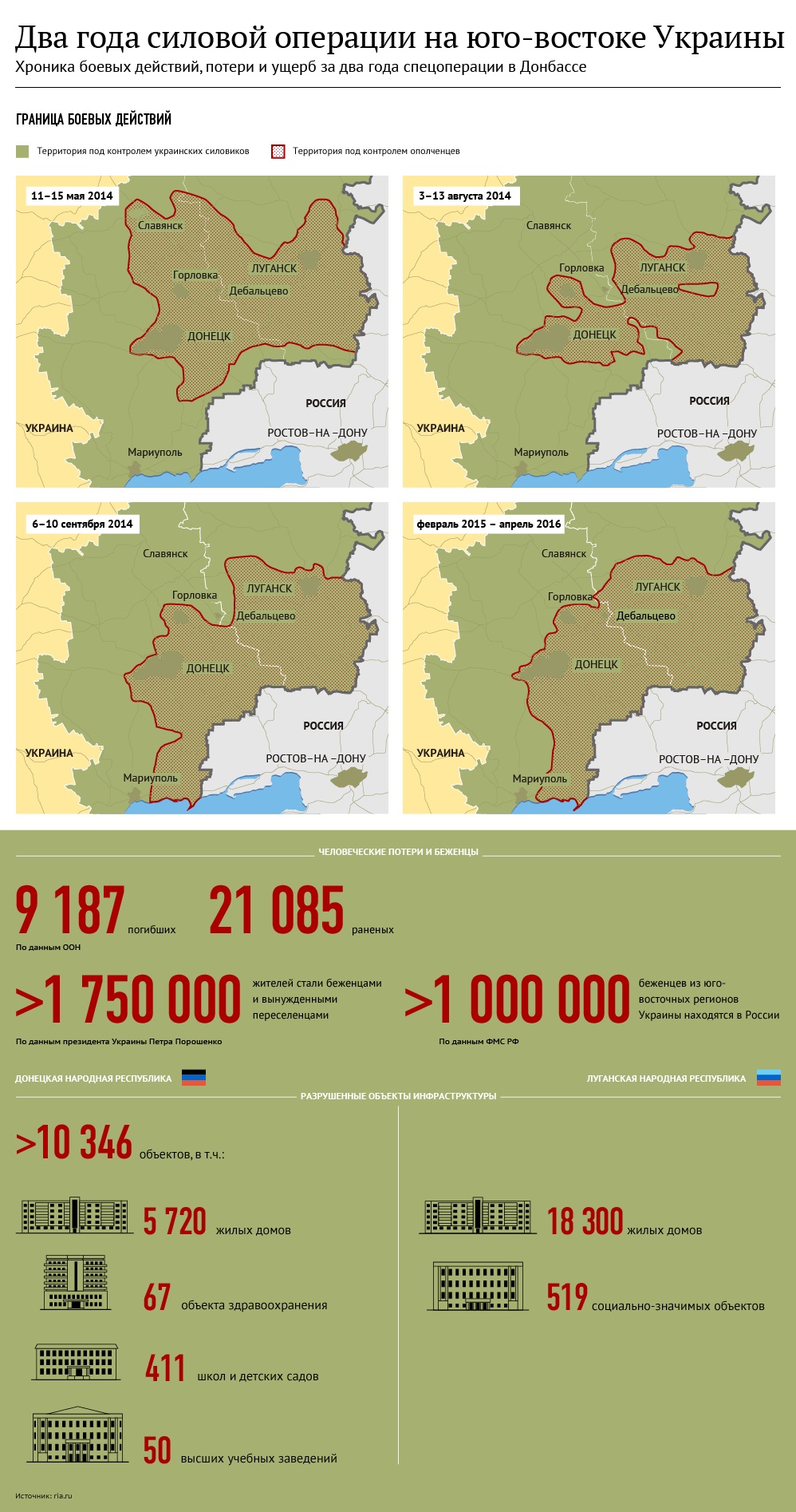 Два года силовой операции на юго-востоке Украины. Хроника боевых действий, потери и ущерб за два года спецоперации в Донбассе в инфографике (30.05.2016)