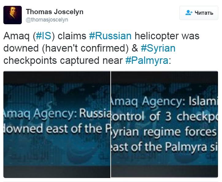 Вечером 8 июля в арабских СМИ со ссылкой на ИГИЛ* появилась информация о том, что на востоке Пальмиры террористы сбили вертолет, причем некоторые информагенства поспешили заявить, что речь идет о вертолете российских ВКС.
