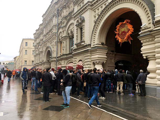 Самые преданные поклонники iPhone стоят у дверей главного универмага Москвы и России с 20:00 вчерашнего дня. За прошедшую ночь покупатели самоорганизовались и составили список, который перестали заполнять, когда число желающих перевалило за 230, дальше начинается живая очередь. К восьми утра в ней стояли уже более 300 человек. Очередь начинается у входа в ГУМ на Никольской улице и заворачивает на Ветошный переулок. Сотрудники магазина раздали стоящим в очереди покупателям бумажные браслеты, по которым начнут продавать телефоны, когда магазин откроется в 10 утра.