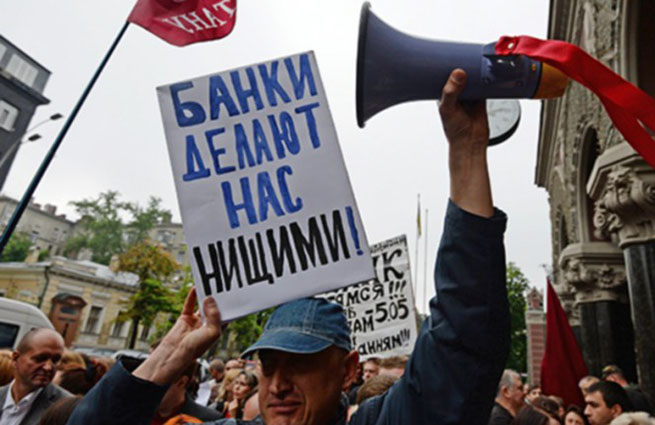 Большиство из тех, кто принимает участие в акции, являются заемщиками долларовых кредитов с 2005 года. Тогда курс гривны к доллару составлял 1 к 5. Не сегодняшний день за одну условную единицу просят уже 12,95 гривны. В связи с тем, что стоимость кредитов стала неподъемной, заемщики требуют введения льготных условий по выплатам. Они подчеркивают, что резкий обвал гривны вызван не только объективными экономическими причинами, но и непрофессионализмом руководства Нацбанка, которое не сумело удержать курс гривны и остановить рост цен в стране.