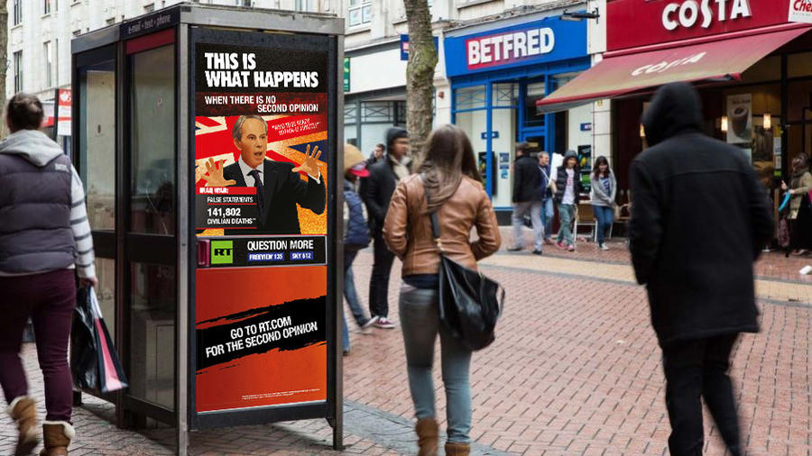 В Лондоне отказались размещать рекламные плакаты RT с изображением бывшего британского премьера Тони Блэра и экс-президента США Джорджа Буша-младшего. Операторы наружной рекламы обосновали такое решение наличием у постеров политического подтекста. Теперь жители британской столицы увидят лишь плакаты с надписью Redacted («подвергнуто цензуре») и названием мобильного приложения телеканала.