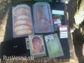 В одной коробке они обнаружили: 5 маленьких пирожков, пару носков, кусок мыла, 2 пачки сигарет, икону и 2 флажка Украины на присосках.