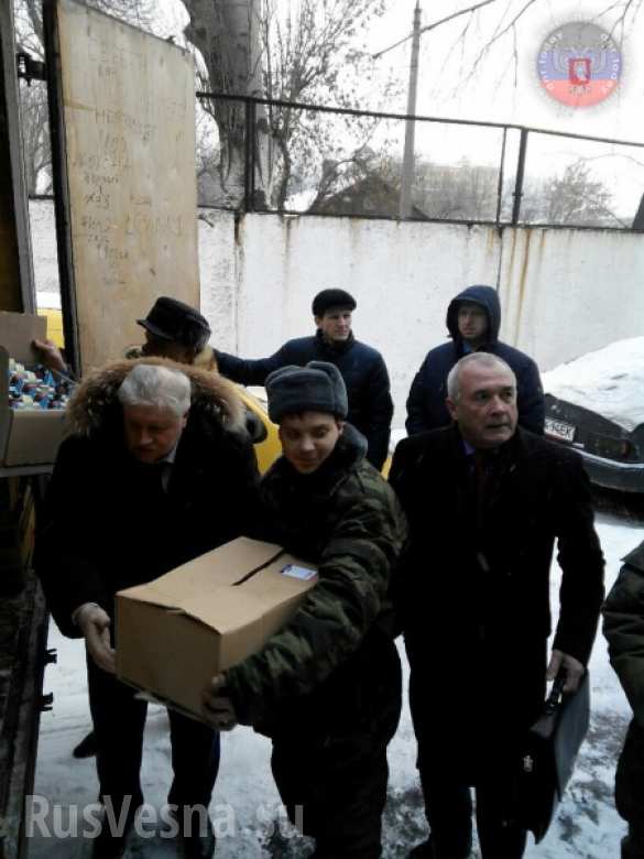Пресс-служба МИД ДНР сообщила, что делегаты от «Справедливой России» привезли жителям ДНР гуманитарную помощь — в первую очередь, продукты питания, а также новогодние подарки для детей.