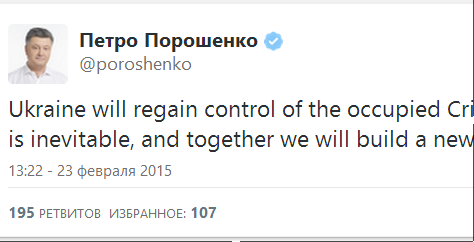 Петр Порошенко пообещал восстановить контроль над "оккупированным" Крымом. Об этом он написал в Twitter.