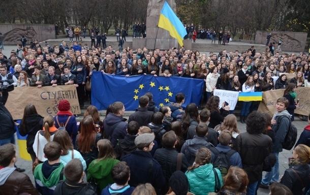 Митинг начался в 14:00. Собравшиеся держат флаги Украины и ЕС и скандируют "Революция!", "Украина, ЕС! С нами правда!", "Ганьба владі!". Кроме того, они держат плакаты "Украина - в ЕС", "Украина - это Европа", "Lviv is EU", "Львов за Украину в ЕС". Митинг проходит на проспекте Свободы около памятника Тарасу Шевченко.
