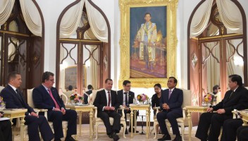 Переговоры премьеров России и Таиланда начались в среду утром в Бангкоке. Переговорам предшествовала официальная церемония встречи российского премьера, после которой ему были представлены послы иностранных государств, аккредитованные в Таиланде.