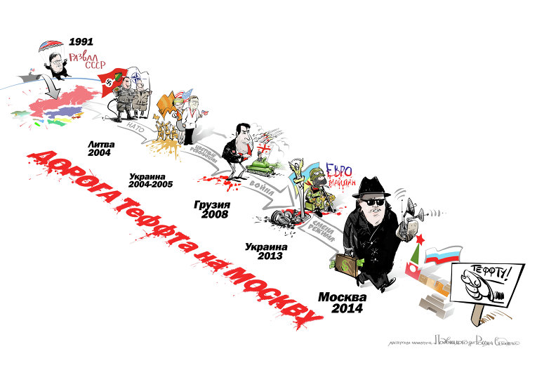 Карикатура была нарисована художником сайта ria.ru Виталием Подвицким в связи с объявлением о назначении Теффта. На ней в сатирическом стиле — с чемоданом долларов и шпионской аппаратурой — изображен путь Теффта, который он прошел как дипломат и представитель США после распада СССР: Литва, Украина, Грузия, Россия."Когда я учился в Джорджтаунском университете, я писал работу по политической карикатуре Оноре Домье, который был великим французским художником и карикатуристом. Карикатура мне очень близка, и я оценил то, как вы изобразили меня", — сказал РИА Новости Теффт.
